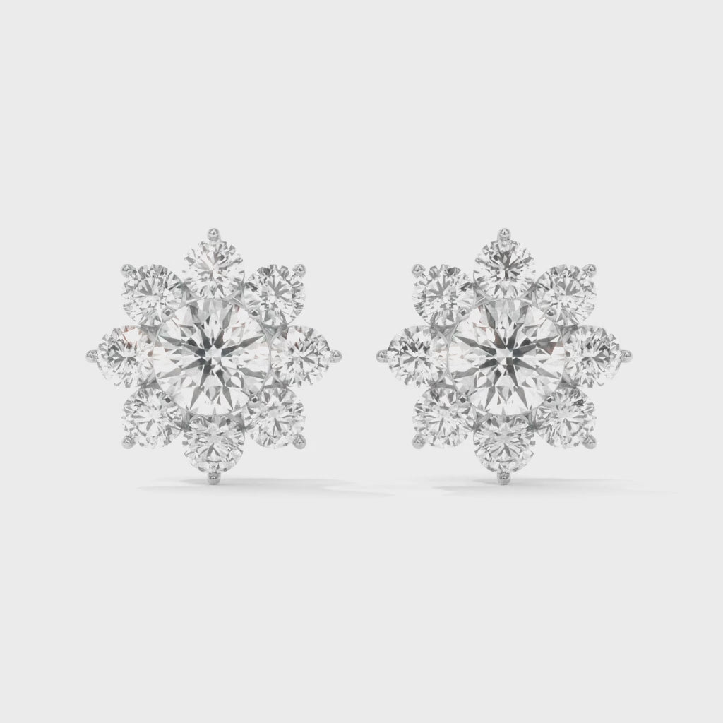 Each earring features a central diamond surrounded by a halo of finely set lab-grown melee diamonds—graded D/E in color and VS/VVS in clarity—for maximum brilliance. The result? A cluster design that radiates like a sunburst, blending classic floral motifs with modern refinement. Whether stacked with hoops or worn solo, they embody the essence of chic, ethical fine jewelry. Not just earrings—your daily dose of brilliance.